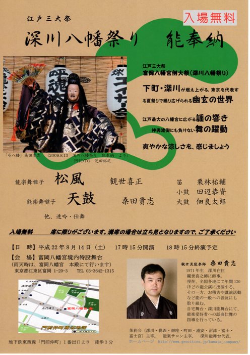 昨年に引き続いて、江戸三大祭の一つ「深川八幡祭り」にて、能の奉納をさせていただきます。