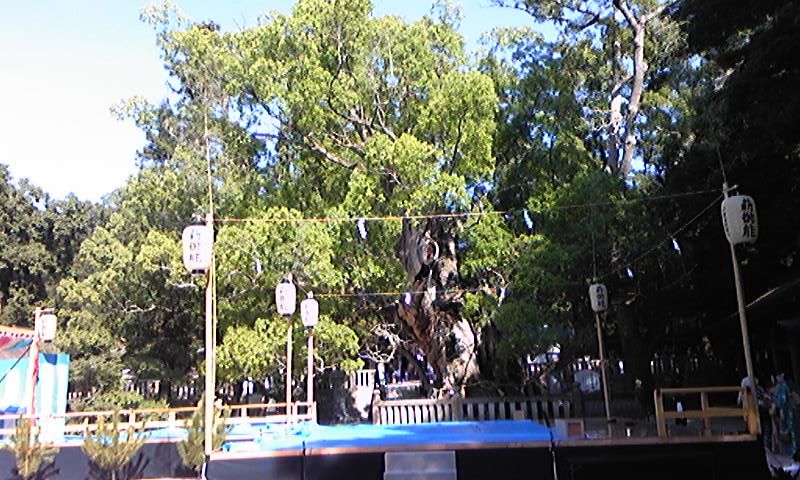 向こうに見えるものは、樹齢2600年を誇る御神木。