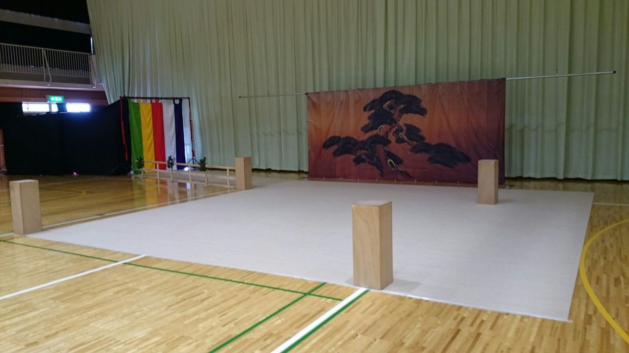 いつものように、体育館にこのような仮設舞台を組んで、能と狂言の公演を行っております。