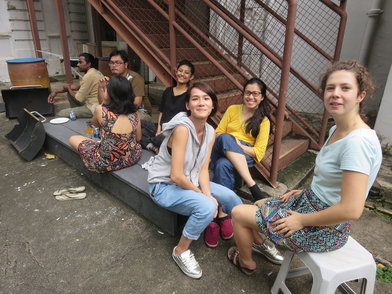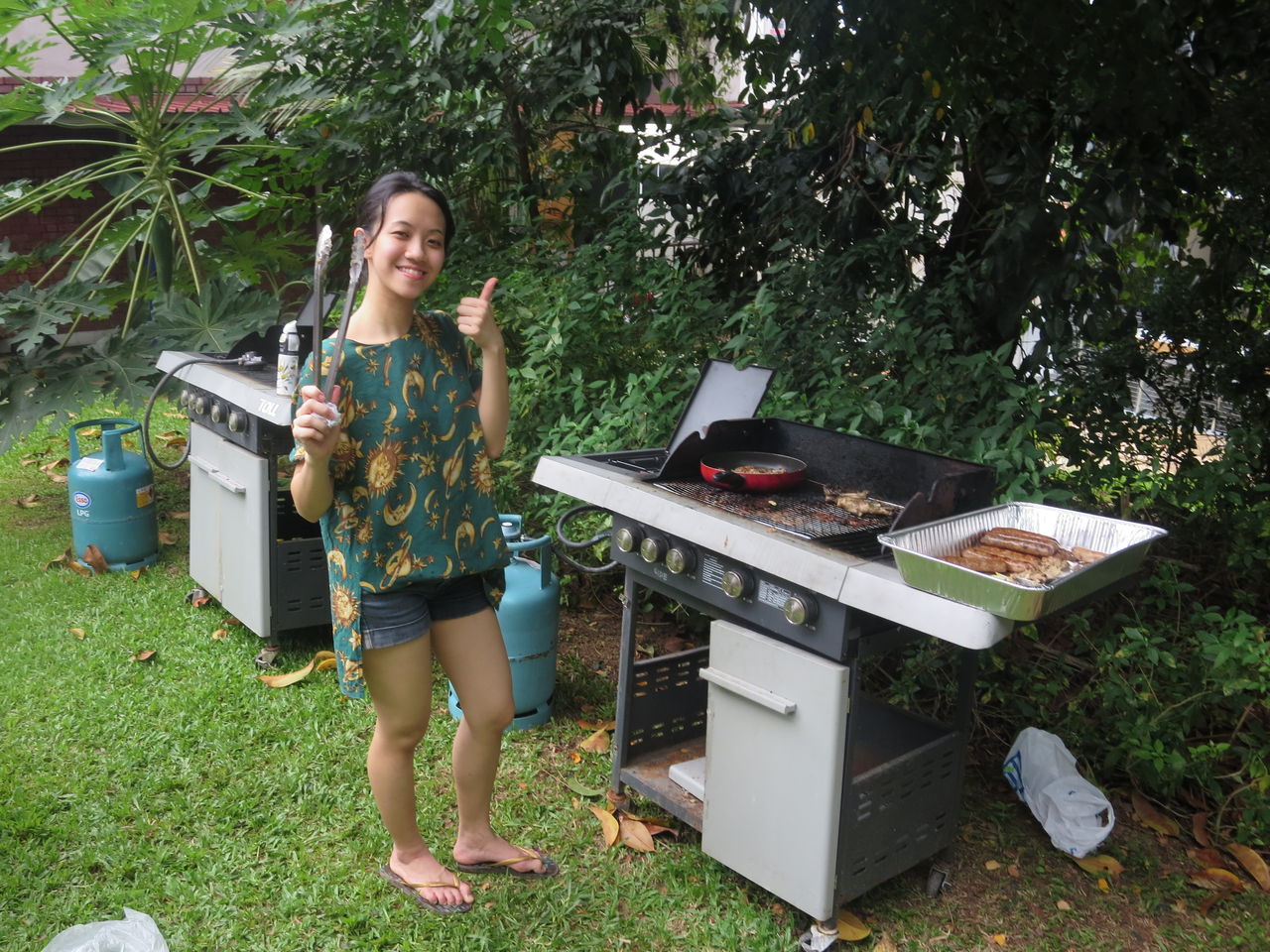 芝生で覆われた中庭で、8か国の学生たちとバーベキュー大会。