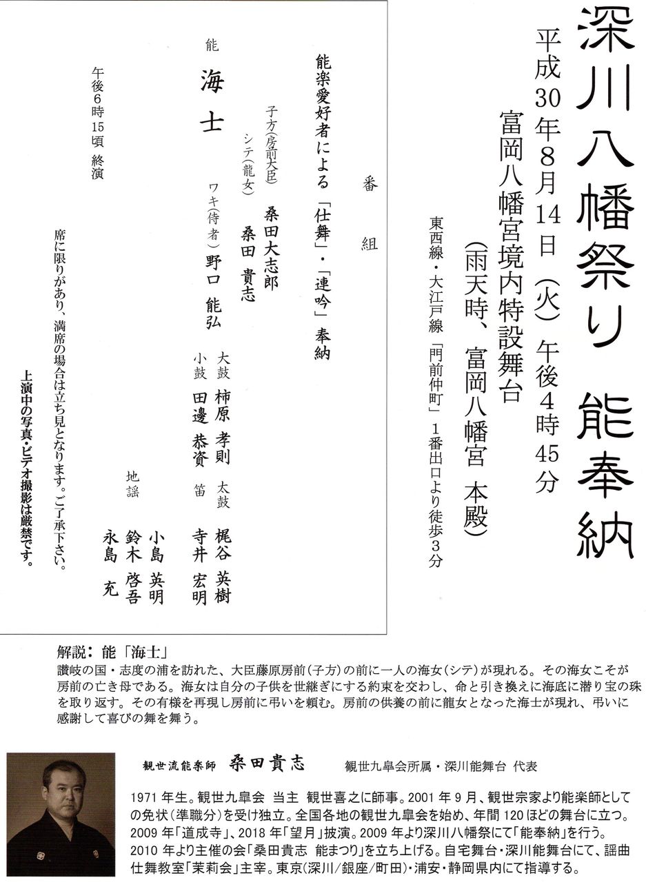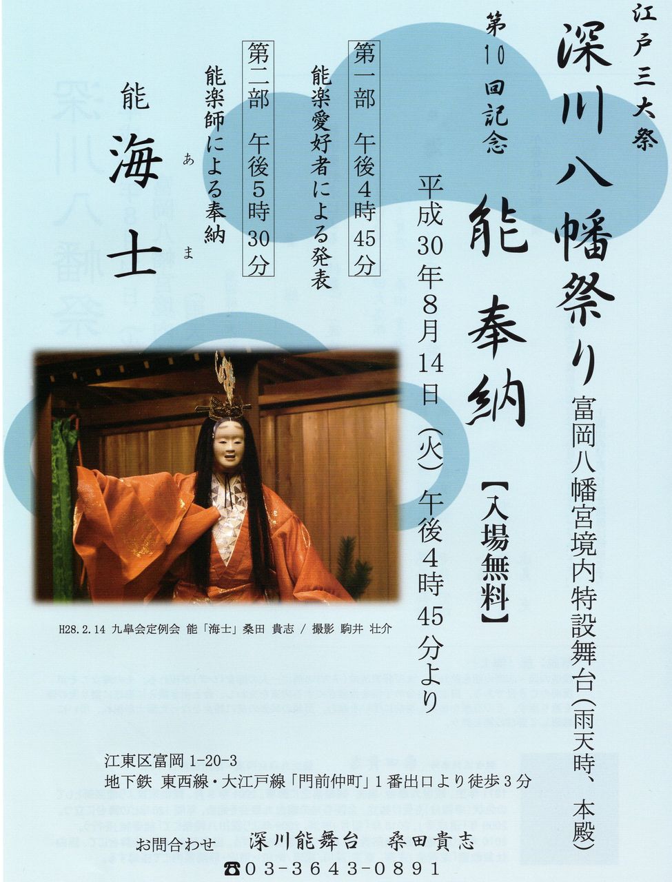 毎年恒例の「深川八幡祭 能奉納」、10回目を迎えた今年は「海士」を奉納しました。