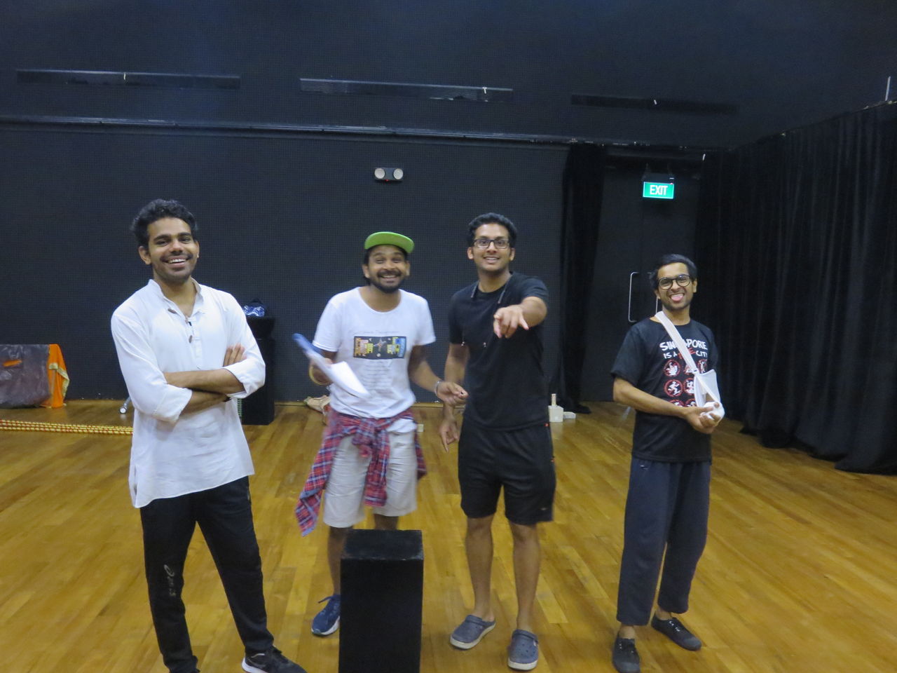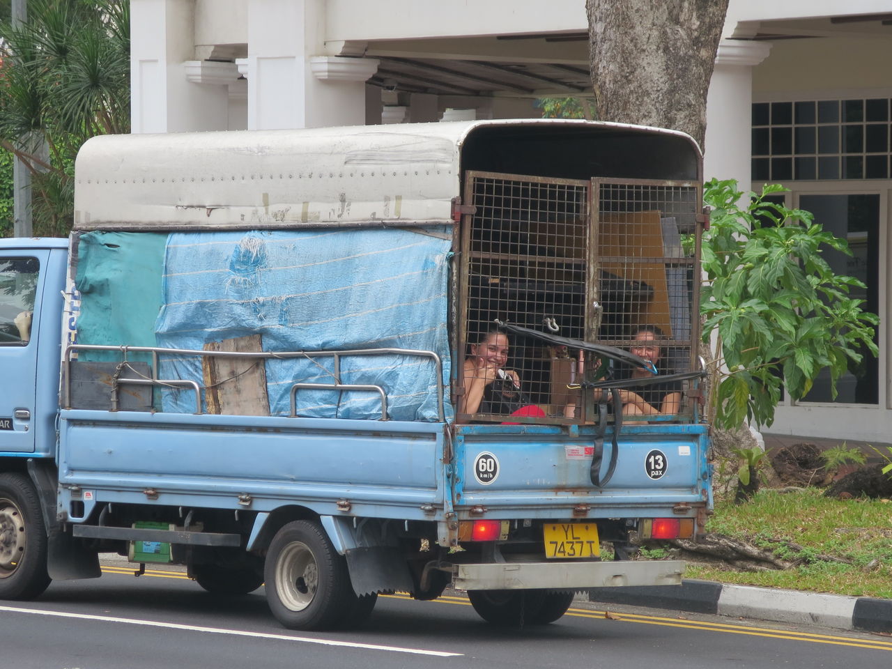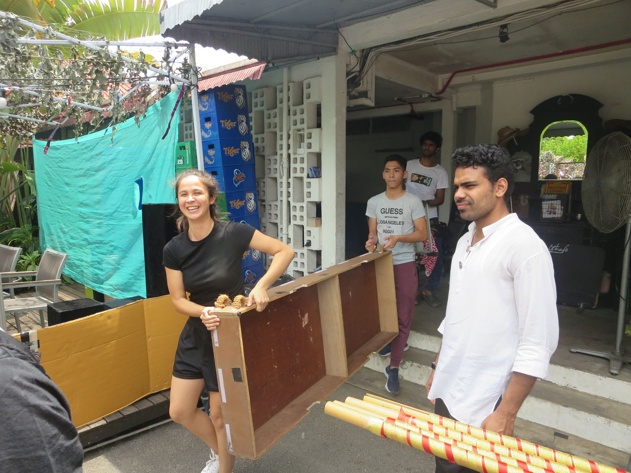 まず学校から、大道具・小道具などを運び込みます。何名かは、トラックの荷台に乗って会場まで移動です。シンガポールでは、トラックの荷台に乗ることは法律上、オッケーだそうです。