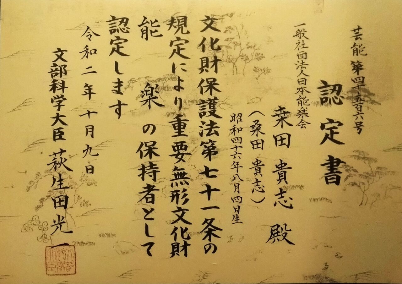 重要無形文化財「能楽」の名を汚さぬよう、これからも芸道に邁進する所存でございます。