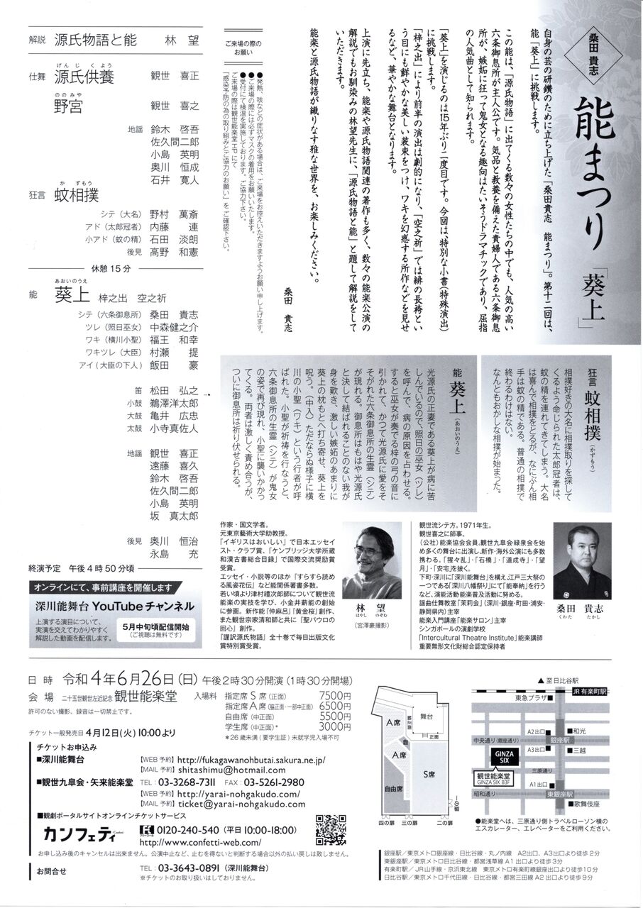 仕舞は、観世喜正師の「源氏供養」と観世喜之師の「野宮」です。どちらも「源氏物語」題材をとった美しい舞です。「野宮」は六条御息所が優美で静かな舞を見せます。「葵上」の激しさとは違う側面が見どころです。