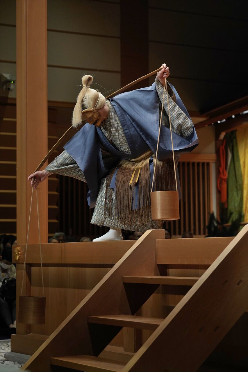 前場の見せ場は、田子で汐を汲む場面です。色んな汲み方がありますが、今回は舞台の外の白洲の水を汲むというケレン味たっぷりの型でいたしました。