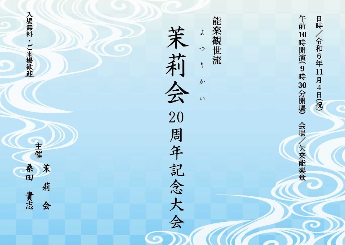 11月4日に、私の社中会「茉莉会20周年記念大会」が、矢来能楽堂にて華々しく開催いたします。