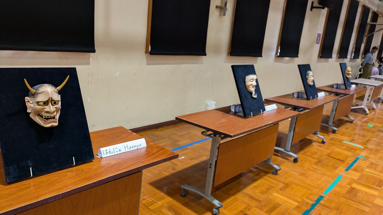 能面など展示し、雰囲気は日本の学校公演と何ら変わりません。