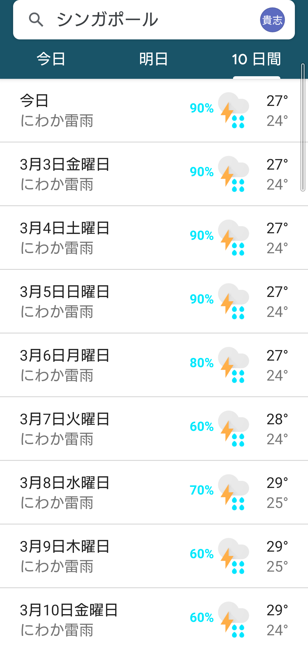 今週の天気はこんな感じです。にわか雷雨という天気予報が、けっこうおかしいです。