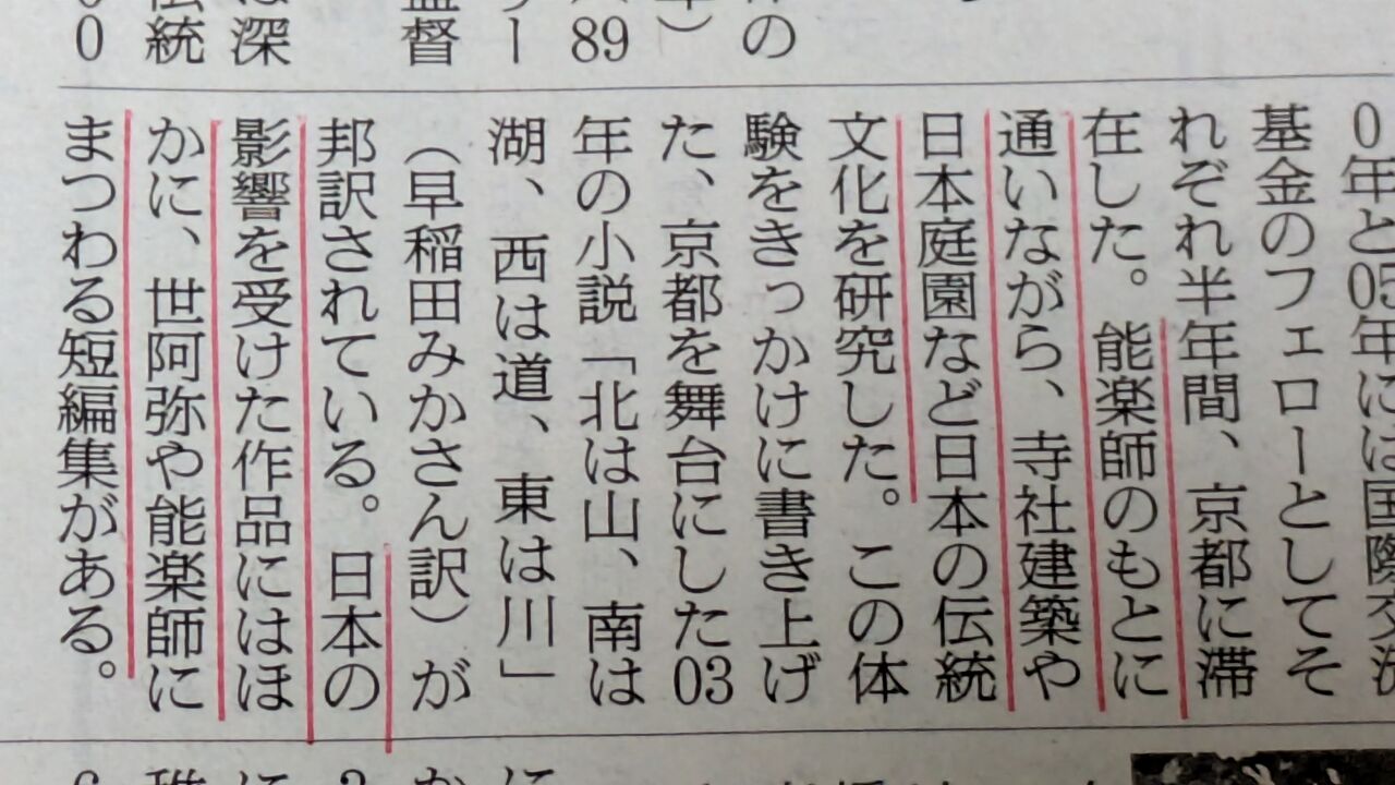 京都で能楽師のもとに弟子入りし、日本の伝統文化を研究したそうです。世阿弥や能楽師にまつわる短編集も書いているそうです。