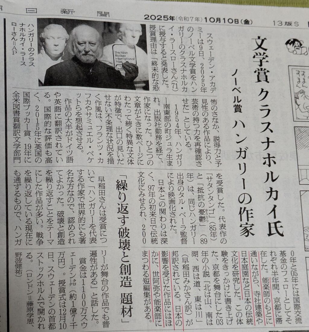今年のノーベル文学賞は、ハンガリーの作家・クラスナホルカイ氏が受賞されました。