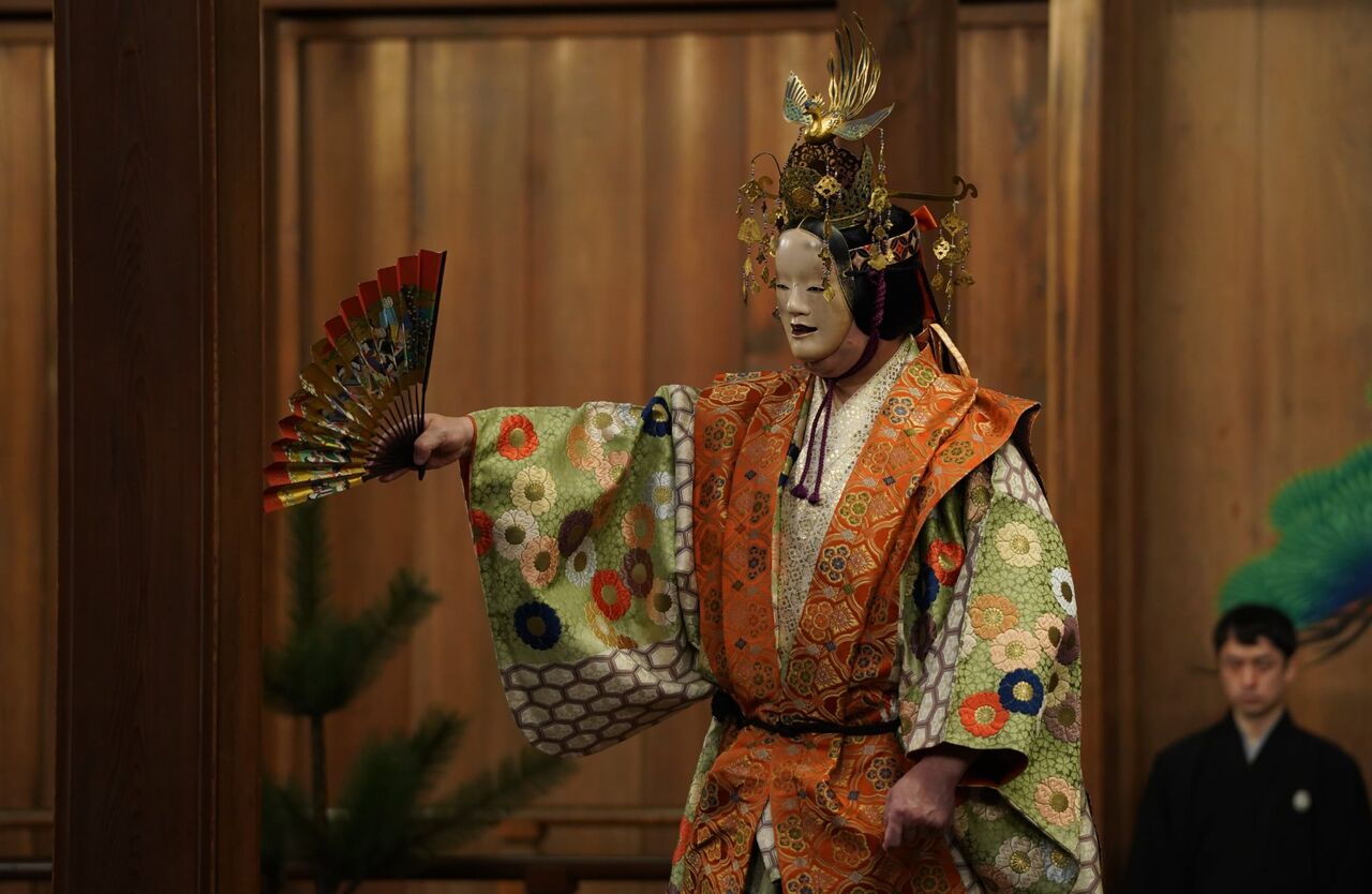 この能は、天冠の上に立てる鳳凰の立て物をかんざしに見立てて、ワキに渡します。