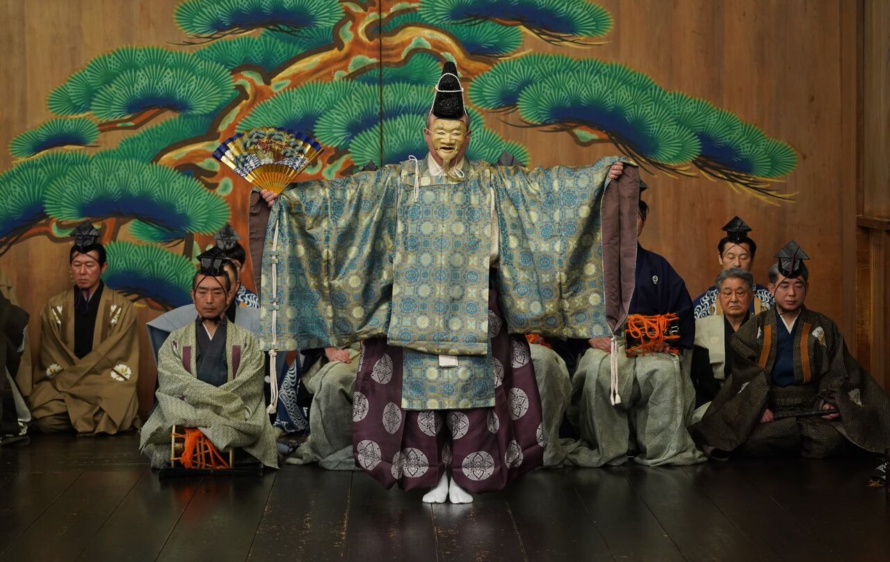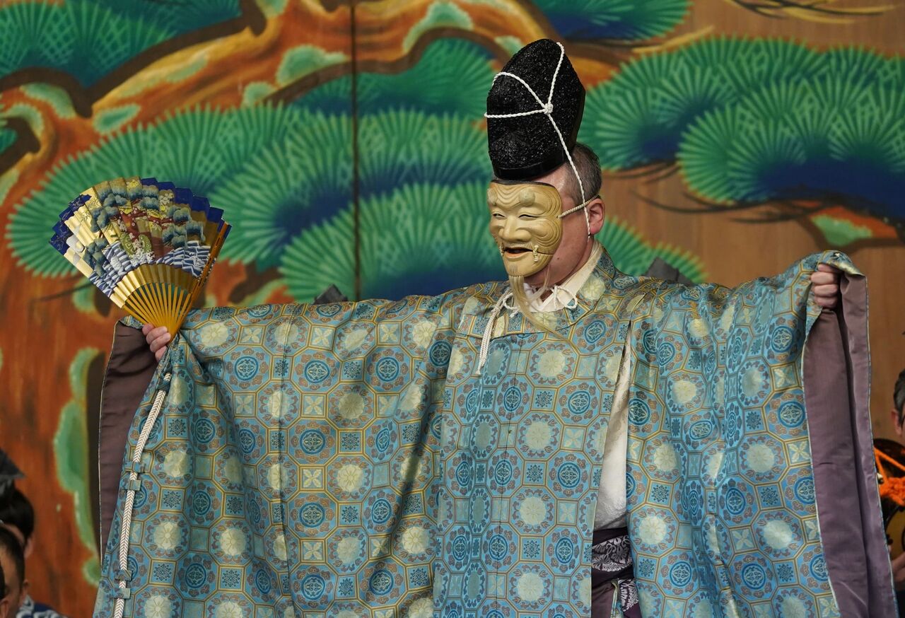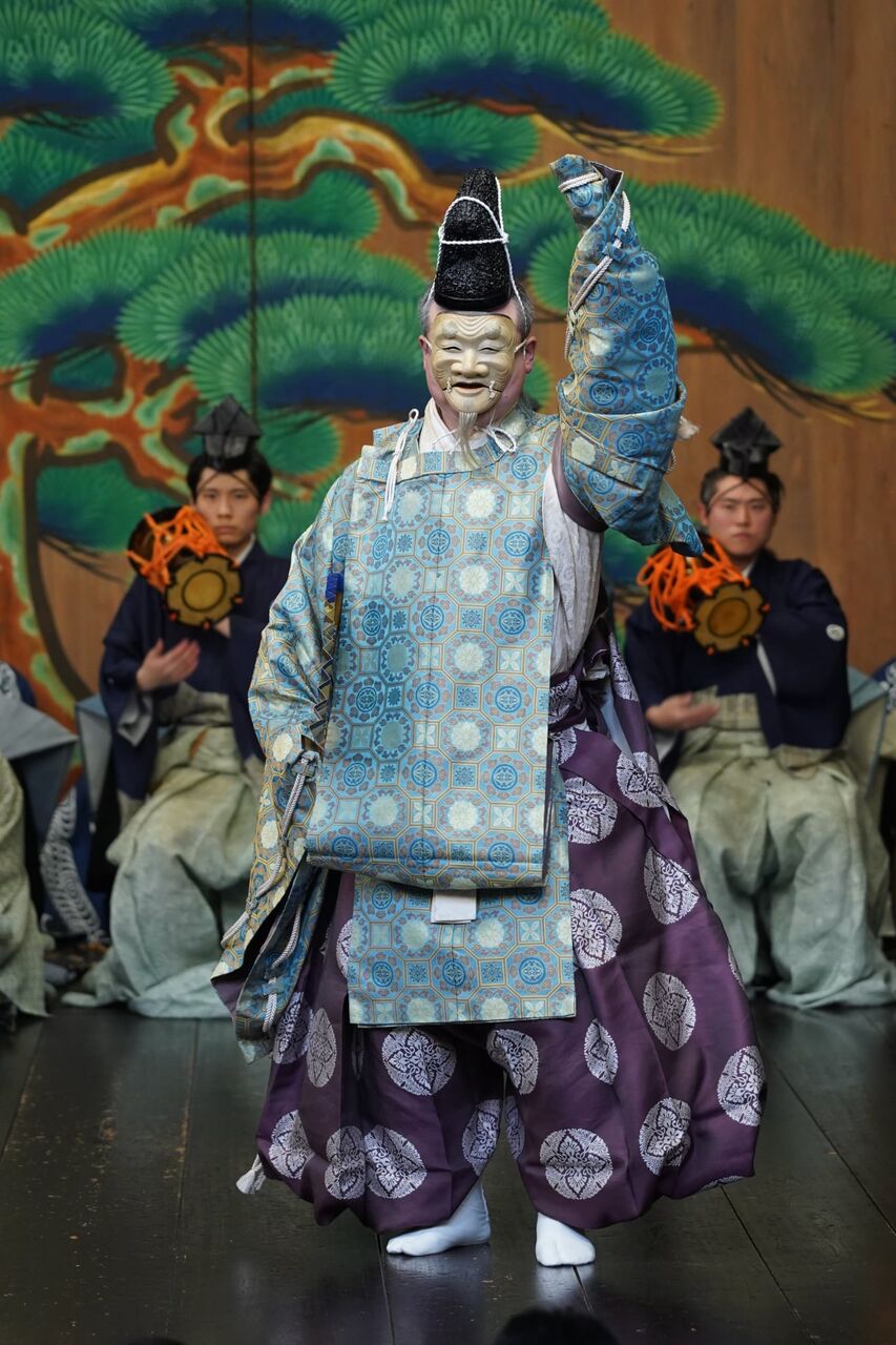 舞台上で能面を着け、演者がご神体になるのが大きな特徴です。