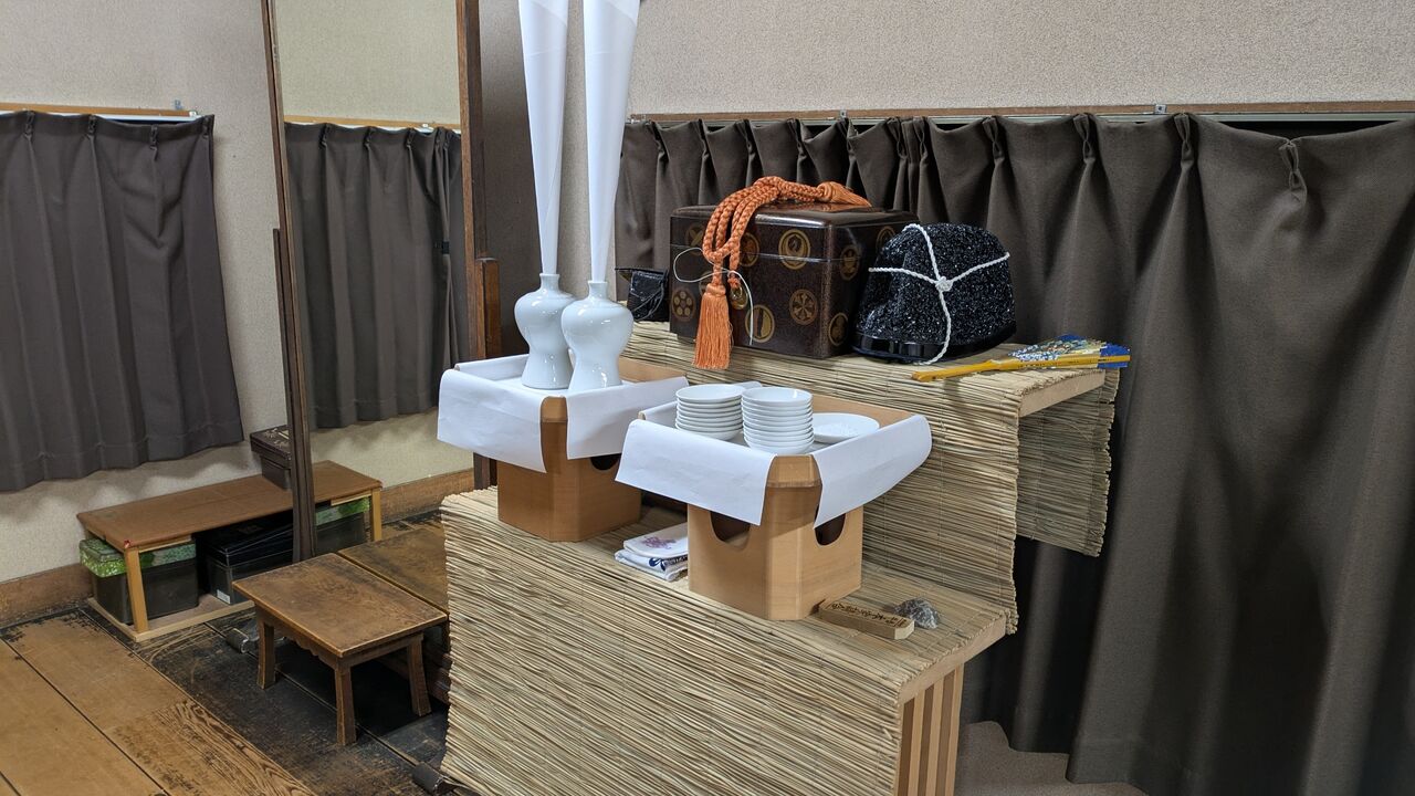 「翁」のときはとにかく準備が大変なのです。楽屋に「翁飾り」という祭壇がしつらえられます。